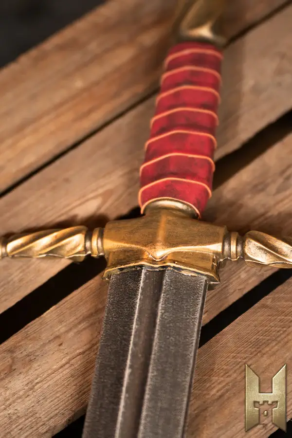Het gevest is waar het Imperial Sword zijn naam echt eer aan doet. De spiraalvormige pareerstang draait weg van de kling en loopt over in een bijpassende spiraalvormige pommel, wat zorgt voor een prachtig en stevig geheel. Het gevest is uit één stuk gegoten, wat de duurzaamheid garandeert zonder in te leveren op detail. De greep is omwikkeld met echt leer, wat zorgt voor een veilige grip, comfortabel gebruik en uitstekende prestaties tijdens veldslagen of lange gamesessies. De ovale vorm van de greep zorgt voor een goede wendbaarheid en een instinctief gevoel voor de richting van je slagen.